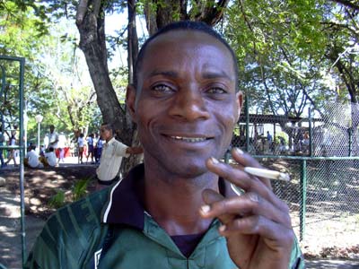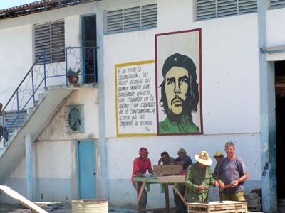 | Im Zentrum der Stadt, die im wesentlichen aus einstöckigen Primitiv-Beton-Bauten und im Zentrum einigen schmucken größeren Häusern aus der Kolonialzeit besteht und einigen Plätzen mit gigantischen Revolutionsdenkmälern, dann eine Buchhandlung mit ungefähr 20 Büchern, dort habe ich einen Stadtplan bekommen, wie er sonst in Info-Büros ausliegt für 3 CUC. Wir sind erstmal ein wenig rumgelaufen und auf eine Hotel-Dachterrasse gestiegen, wo man einen schönen Ausblick hatte. Dann wollten wir eine Rundfahrt machen, man wird auch dauernd angequatscht, ob man ein Taxi will oder Zigarren oder sonst was. So haben wir Wilfredo und seinen Neffen Hubert kennengelernt, er angeblich Tierarzt in einer Ziegenfarm, Hubert irgendwas undurchschaubares. Aber Hubert hat einen 24- jährigen Mosquitsch, mit dem sie uns dann zu den Sehenswürdigkeiten bringen wollten. Zuerst die Tabakfabrik, die man aber leider nicht besichtigen konnte, da irgendwas kaputt sei. Vor der Tabakfabrik dann geheimnisvolles Tun, wir sind dann eine Straße weiter verstohlen in ein Haus gelotst worden, wo man uns im Halbdunkeln Zigarren angeboten hat, die berühmten Cohibas für ich glaube 24 Stück 90 CUC und andere für 40 oder 50 CUC, sonst würden die das doppelte kosten. Die Bayern haben welche mitgenommen. | |
