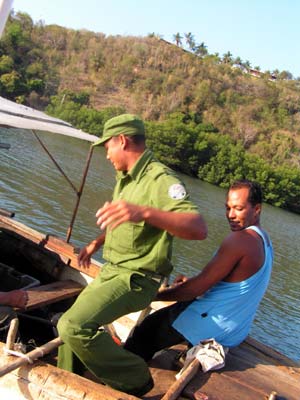 Liebe Grüße aus dem sonnigen Kuba, Euer Jürgen 8.3.06 Hallo Ihr Lieben, Portillo ist eine wunderschöne Bucht mit Palmenstränden und 2 schönen Hotels, wo hauptsächlich Kanadier und Deutsche Urlaub machen. Im einen ist "all inclusiv" und der Barmann an der Strandbar wollte für das Bier nichts kassieren. Wir haben Wasser in Kanistern geholt und dann das Dorf der Kubaner besucht. Morgens war eine Fischerin mit 2 Polizisten zum Boot gerudert, die lange Papiere ausgefüllt haben und unsere Befahrenserlaubnis mitgenommen haben. Heute früh ist der Polizist selbst zu uns gerudert und hat die Befahrenserlaubnis zurückgebracht. Die Fischerin hat uns - ohne daß die Polizei davon wissen darf - Gemüse, Eier und Pulpo gegeben - Wir sollten bezahlen, was wir für richtig hielten. Leider ist der Segelwind immer noch schwach, so daß wir viel motoren müssen. Mal sehen, wie lange der Diesel reicht.. | |